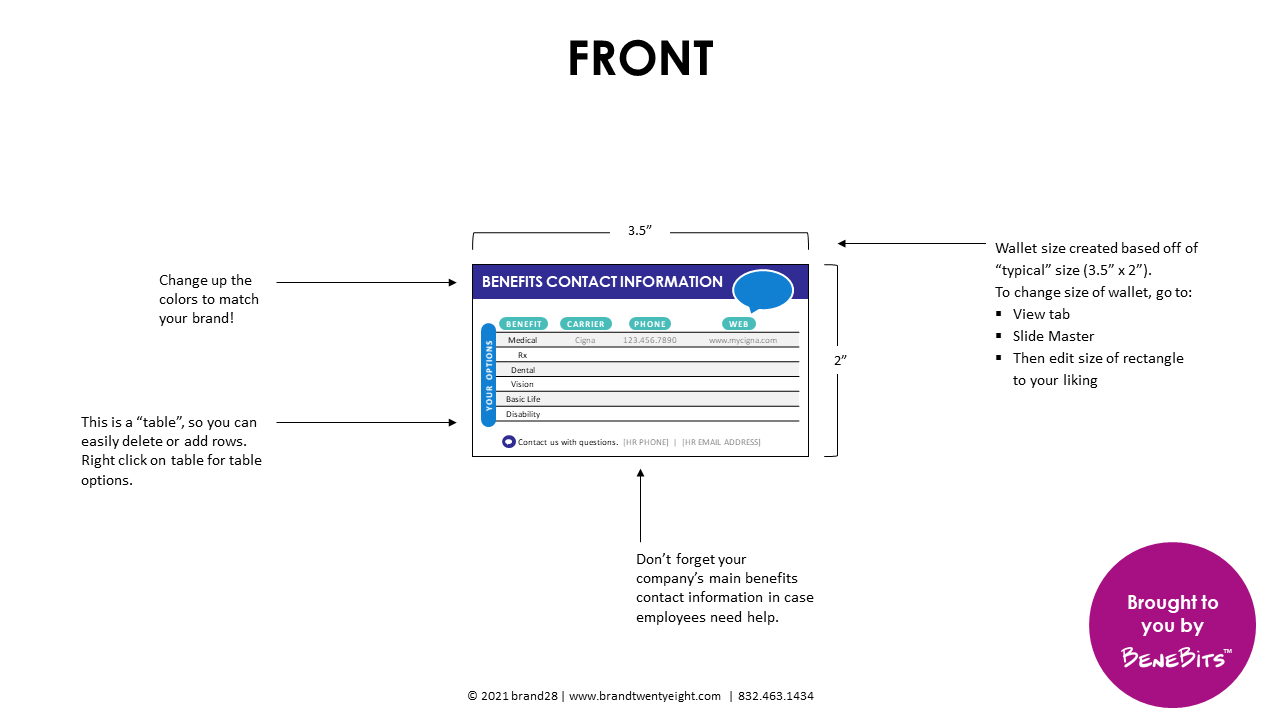This template allows you to create a snapshot of important benefits information that employees can print and conveniently place in their wallet or purse.